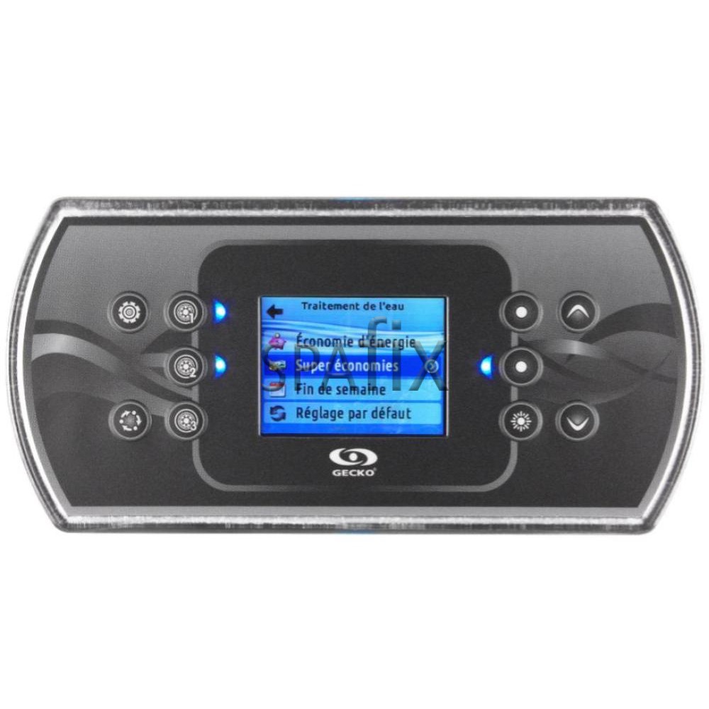 Gecko in.k806 kontrolpanel med baggrundsbelyst farveskærm og 10 knapper. Kompatibel med Gecko X- og Y-seriens styrebokse. Velegnet til styring af op til 5 pumper, blæser og lys.