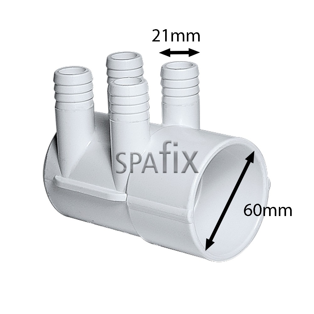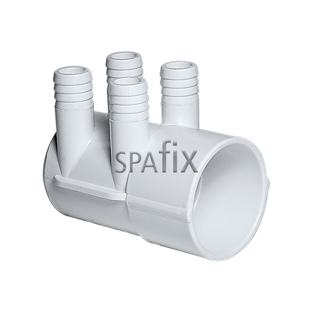 Denne højkvalitets (Schedule 40), højtryks ABS-plastikforbindelse giver dig mulighed for at forgrene en 2-tommers rør eller slange med indvendig diameter på 60 mm til 4x 3/4″ slanger med indvendig diameter på 19-20mm.