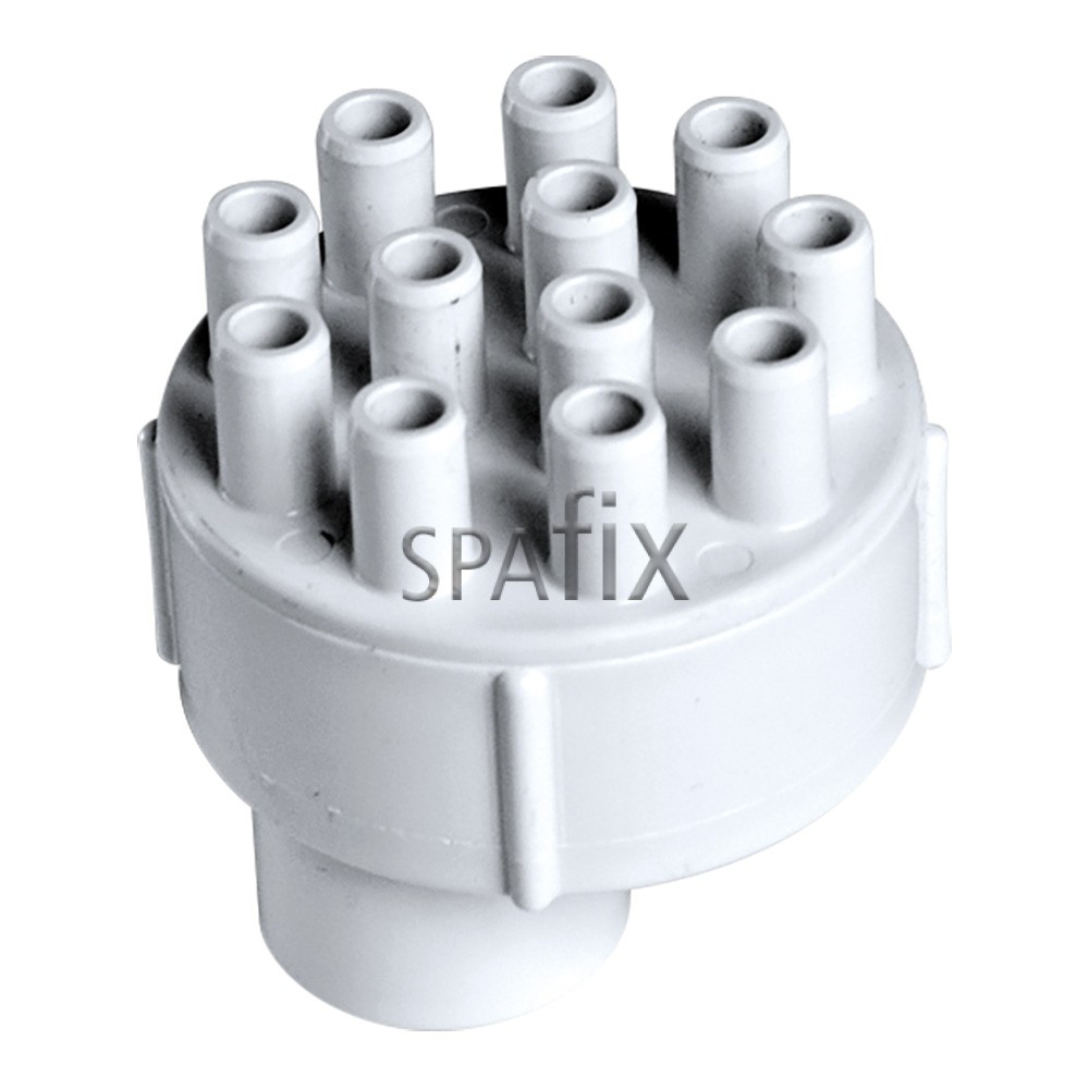 Denne højkvalitets (Schedule 40), højtryks ABS-plastikforbindelse giver dig mulighed for at forgrene en 1-tommers rør eller slange med indvendig diameter på 33 mm til 12x 3/8″ luftslanger med indvendig diameter på 11mm.
