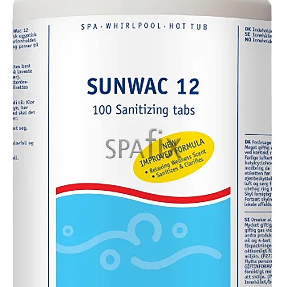Med SunWac 12 opnår du rent og velduftende vand i dit spabad. Produktet er tilsat organisk egyptisk mynteekstrakt, som giver vandet en dejlig, afslappende duft, samtidig med at klorindholdet i tabletten sikrer, at du bader i rent vand.