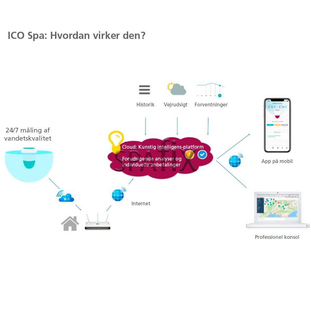 Du kan se alle disse oplysninger i realtid idet du har adgang til alle data, der er indsamlet af ICO på din smartphone eller tablet. ICO hjælper dig også med at vedligeholde din spa ved at foreslå, hvornår og hvordan du skal behandle din spa for at opretholde perfekt vand med optimal brug af vandpleje produkter.
