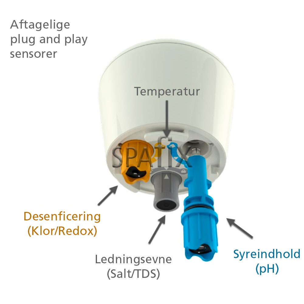 • Aftagelige Plug and Play-sensorer: desinfektionsmiddel ved hjælp af Redox, pH, ledningsevne (salt/TDS)