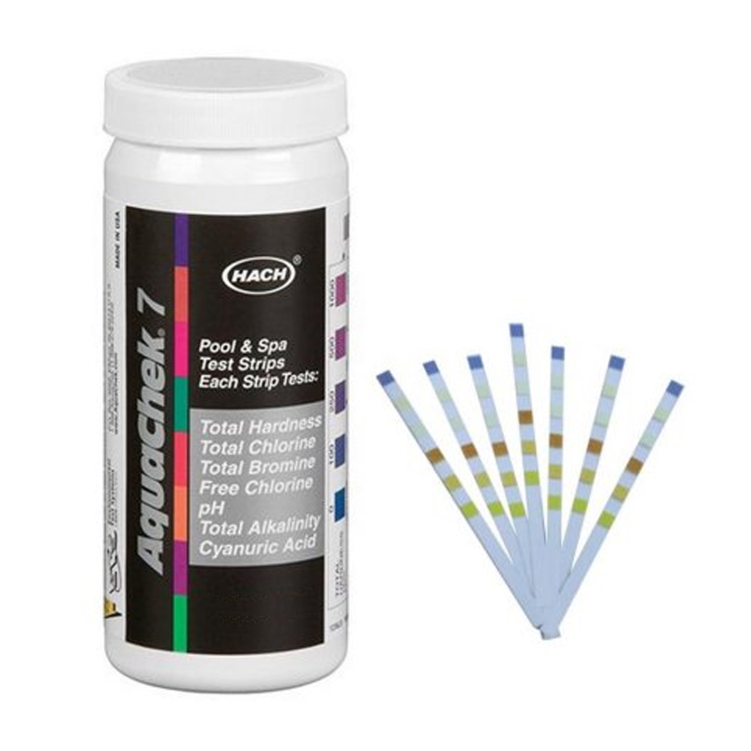 Teststrips Aquacheck 7, måler frit klor, total klor, bromin, alkalinitet, total hårdhed, pH-værdi og Cyanursyre. – 50 strips